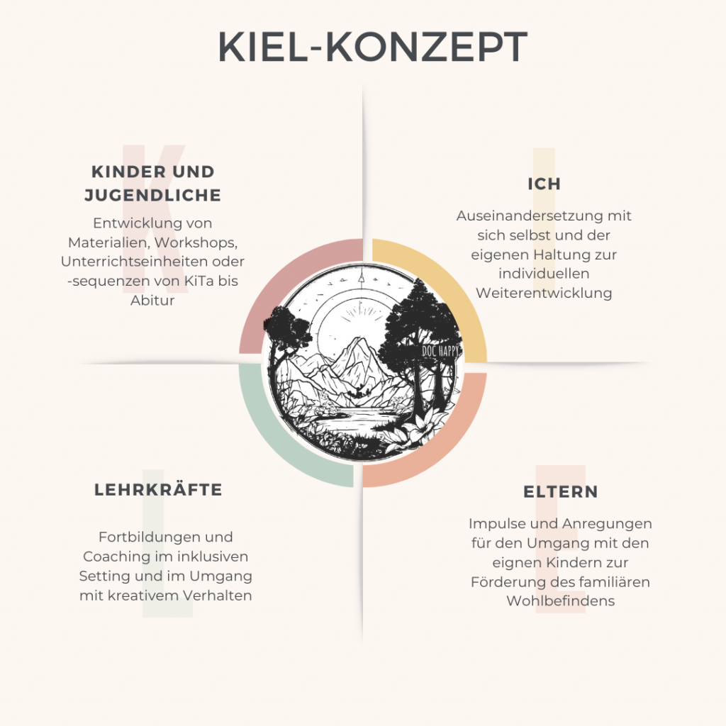 Mein Ansatz basiert auf der Überzeugung, dass eine ganzheitliche Betrachtung und Unterstützung in allen Lebensbereichen zu einer harmonischen Entwicklung beitragen. Das KIEL-Konzept integriert vier Schlüsselbereiche: